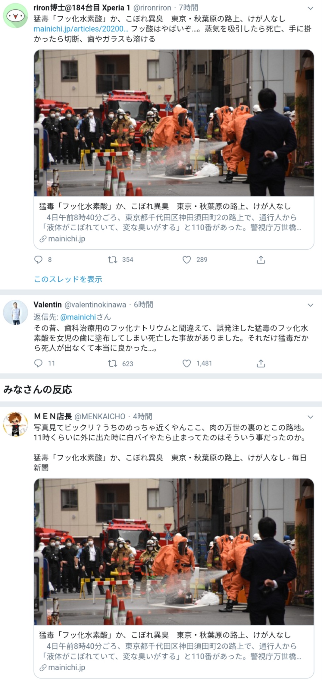【悲報】秋葉原で猛毒「フッ化水素酸」がばら撒かれた模様!!!!! 投稿日 2020年6月5日 10:16:46 (AKB関連) Tweet スポンサードリンク 続きを読む Source: AKB48タイムズ(AKB48まとめ) スポンサードリンク 続きを読む>> 最新情報 【朗報】AKB48のマレーシアイベント、大盛況で無事に終了!!! 【画像】この子アイドルで通用しますか?【HKT487期研究生 江浦優香13才】 【朗報】外ドラマ出演のAKB48山﨑空ちゃんの演技が上手いと話題に【あなたの恋人、強奪します。/そらら】 【朗報】近々新曲のMV撮影が行われる模様!【AKB48】 【朗報】19期研究生全員当たり!!!【AKB48劇場公演デビュー】 【朗報】ベルク×ニップン「AKB48 17期生 もちっとおいしいコラボキャンペーン」がスタート!!! 【速報】最新の久保怜音さんがキタ━━━━(゚∀゚)━━━━!!【元AKB48さとぴー】 【速報】STU48森下舞羽が卒業発表!!【まいはっち】 【AKB48】村山彩希さん、ついにインスタの個人アカウントを作る!!【ゆいリーInstagramデビュー】 【AKB48】クアラルンプール2日目、髙橋彩音ちゃんにぶっかけられて喜ぶ現地民をご覧下さい【マレーシア】 【悲報】地下アイドル現場怖い😱 女優業って正直ファンとしては辛い事ばかりで全然嬉しくないよね?【AKB48/SKE48/NMB48/HKT48/NGT48/STU48】 【朗報】元AKB48チームTP・邱品涵さん、福岡ソフトバンクホークスのチアガールに転身し大成功!!! 【AKB48】卒業記念生写真を出せるメンバーの基準ってどうなってんの? 【朗報】元AKB48奥原妃奈子さん、渋谷の大型ビジョンに現れる!【元チーム8ひーな】 昨日は岡田パッパの誕生日です【元AKB48岡田奈々】 【悲報】アイドルさん、ビラ配り中にまたしても酷い目に遭ってしまう【カリギュラのぶちあげイエロー担当ゆめぴりか】 【朗報】NGT48奈良未遥、ファースト写真集「こんな風に見られているのか?」7月1日発売決定!!! 【KLP48】クアラルンプール2日目に起こりそうなこと【AKB48】 今度こそ正真正銘のずっきーの谷間キタあああああ?【AKB48山内瑞葵】 【衝撃】松井珠理奈がアイドル復帰!マレーシア初の48姉妹グループ・KLP48プレイングマネージャーに就任決定!正式発表【元SKE48】 【AKB48】オリジナルステッカー販売終了のお知らせ【ピンポン玉チャレンジ】 【朗報】元馬嘉伶の真楪伶が1st写真集を発売決定!!【元AKB48・元まちゃりん・奇跡と出会った瞬間】 初めてAKB48劇場に入る私にアドバイス下さい!! スクエニ『トワツガイ』が僅か1年でサービス終了!大西桃香、渡辺みり愛、長谷川玲奈が実写化したのに【舞台化・元AKB48/元乃木坂46/元NGT48】 【悲報】=LOVE大谷映美里、体調不良のため本日の「個別お話し会」を欠席・・・【指原莉乃プロデュースアイドル・イコラブ・イコールラブ】 「ゆいずき」のダブルセンターというAKB48最強のカード【小栗有以・山内瑞葵】 【朗報】AKB48橋本陽菜、マレーシア移籍は断ったけど、旅行気分の数日間なら喜ぶ!!【はるぴょん】 【AKB48】メンバーが公演後に受け取ったファンレターをうpしてるのだが、どう思う? 【AKB48】正鋳真優「いつかAKBにチーム制を復活させたい」【まさるさん】 木村拓哉、フェイスガード姿で撮影再開を報告「新しい現場のルール」 女性アイドルが「うわヲタクキモっ!」と思うことも誹謗中傷になるのになんで女性アイドルは逮捕されないんだ?【AKB48/SKE48/NMB48/HKT48/NGT48/STU48/チーム8/乃木坂46/欅坂46/日向坂46】