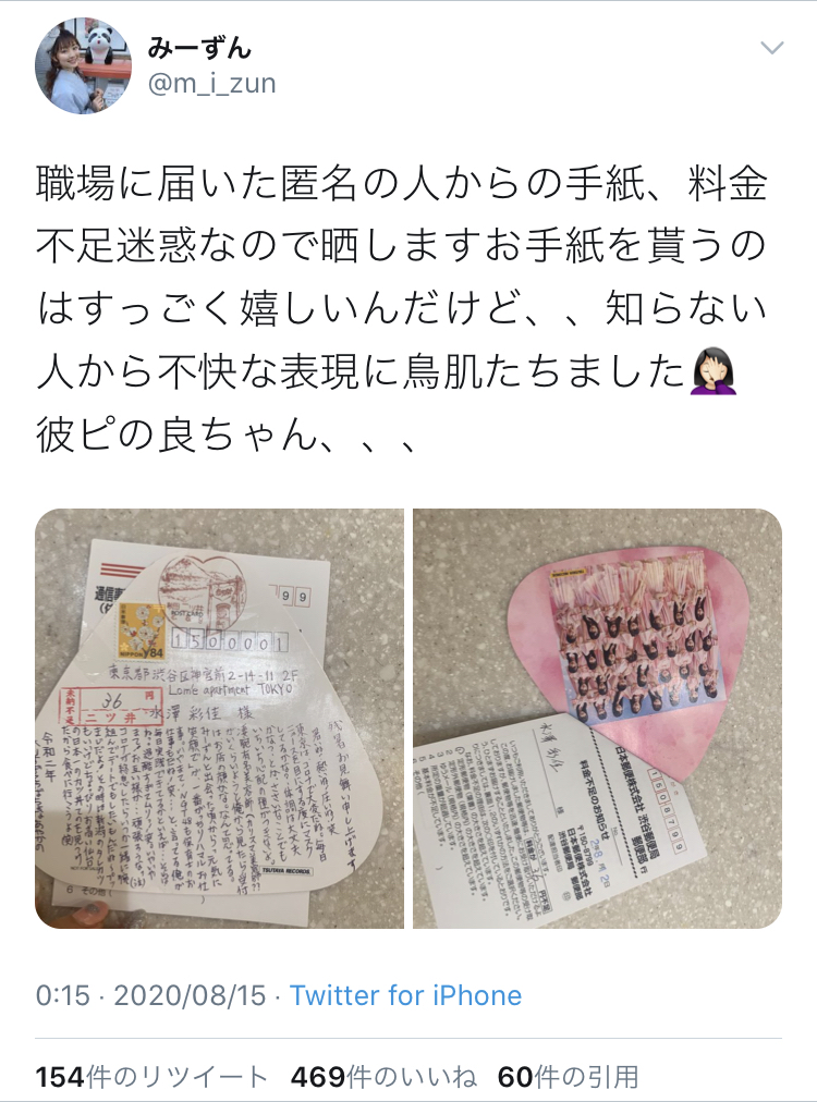 【悲報】NGT48ヲタ、卒業メンバーの職場に匿名でキモすぎる手紙を送ってしまう・・・【水澤彩佳】 投稿日 2020年8月16日 16:54:06 (AKB関連) Tweet スポンサードリンク 続きを読む Source: AKB48タイムズ(AKB48まとめ) スポンサードリンク 続きを読む>> 最新情報 【朗報】AKB48のマレーシアイベント、大盛況で無事に終了!!! 【画像】この子アイドルで通用しますか?【HKT487期研究生 江浦優香13才】 【朗報】外ドラマ出演のAKB48山﨑空ちゃんの演技が上手いと話題に【あなたの恋人、強奪します。/そらら】 【朗報】近々新曲のMV撮影が行われる模様!【AKB48】 【朗報】19期研究生全員当たり!!!【AKB48劇場公演デビュー】 【朗報】ベルク×ニップン「AKB48 17期生 もちっとおいしいコラボキャンペーン」がスタート!!! 【速報】最新の久保怜音さんがキタ━━━━(゚∀゚)━━━━!!【元AKB48さとぴー】 【速報】STU48森下舞羽が卒業発表!!【まいはっち】 【AKB48】村山彩希さん、ついにインスタの個人アカウントを作る!!【ゆいリーInstagramデビュー】 【AKB48】クアラルンプール2日目、髙橋彩音ちゃんにぶっかけられて喜ぶ現地民をご覧下さい【マレーシア】 【悲報】地下アイドル現場怖い😱 女優業って正直ファンとしては辛い事ばかりで全然嬉しくないよね?【AKB48/SKE48/NMB48/HKT48/NGT48/STU48】 【朗報】元AKB48チームTP・邱品涵さん、福岡ソフトバンクホークスのチアガールに転身し大成功!!! 【AKB48】卒業記念生写真を出せるメンバーの基準ってどうなってんの? 【朗報】元AKB48奥原妃奈子さん、渋谷の大型ビジョンに現れる!【元チーム8ひーな】 昨日は岡田パッパの誕生日です【元AKB48岡田奈々】 【悲報】アイドルさん、ビラ配り中にまたしても酷い目に遭ってしまう【カリギュラのぶちあげイエロー担当ゆめぴりか】 【朗報】NGT48奈良未遥、ファースト写真集「こんな風に見られているのか?」7月1日発売決定!!! 【KLP48】クアラルンプール2日目に起こりそうなこと【AKB48】 今度こそ正真正銘のずっきーの谷間キタあああああ?【AKB48山内瑞葵】 【衝撃】松井珠理奈がアイドル復帰!マレーシア初の48姉妹グループ・KLP48プレイングマネージャーに就任決定!正式発表【元SKE48】 【AKB48】オリジナルステッカー販売終了のお知らせ【ピンポン玉チャレンジ】 【朗報】元馬嘉伶の真楪伶が1st写真集を発売決定!!【元AKB48・元まちゃりん・奇跡と出会った瞬間】 初めてAKB48劇場に入る私にアドバイス下さい!! スクエニ『トワツガイ』が僅か1年でサービス終了!大西桃香、渡辺みり愛、長谷川玲奈が実写化したのに【舞台化・元AKB48/元乃木坂46/元NGT48】 【悲報】=LOVE大谷映美里、体調不良のため本日の「個別お話し会」を欠席・・・【指原莉乃プロデュースアイドル・イコラブ・イコールラブ】 「ゆいずき」のダブルセンターというAKB48最強のカード【小栗有以・山内瑞葵】 【朗報】AKB48橋本陽菜、マレーシア移籍は断ったけど、旅行気分の数日間なら喜ぶ!!【はるぴょん】 【AKB48】メンバーが公演後に受け取ったファンレターをうpしてるのだが、どう思う? 【AKB48】正鋳真優「いつかAKBにチーム制を復活させたい」【まさるさん】 【NMB48】吉田朱里さん、池上彰を論破してしまう!!!!【アカリン】 【AKB48】村山彩希が元NMB48山本彩のツアーシャツ着てるけど【ゆいりー・さや姉】
