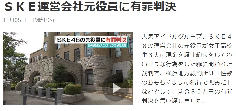 SKE48運営会社元役員、海老根一也被告(59)に有罪判決「性欲のおもむくままの犯行で悪質」【コアターゲット】 投稿日 2020年11月6日 11:57:39 (AKB関連) Tweet スポンサードリンク 続きを読む Source: AKB48タイムズ(AKB48まとめ) スポンサードリンク 続きを読む>> 最新情報 【朗報】AKB48のマレーシアイベント、大盛況で無事に終了!!! 【画像】この子アイドルで通用しますか?【HKT487期研究生 江浦優香13才】 【朗報】外ドラマ出演のAKB48山﨑空ちゃんの演技が上手いと話題に【あなたの恋人、強奪します。/そらら】 【朗報】近々新曲のMV撮影が行われる模様!【AKB48】 【朗報】19期研究生全員当たり!!!【AKB48劇場公演デビュー】 【朗報】ベルク×ニップン「AKB48 17期生 もちっとおいしいコラボキャンペーン」がスタート!!! 【速報】最新の久保怜音さんがキタ━━━━(゚∀゚)━━━━!!【元AKB48さとぴー】 【速報】STU48森下舞羽が卒業発表!!【まいはっち】 【AKB48】村山彩希さん、ついにインスタの個人アカウントを作る!!【ゆいリーInstagramデビュー】 【AKB48】クアラルンプール2日目、髙橋彩音ちゃんにぶっかけられて喜ぶ現地民をご覧下さい【マレーシア】 【悲報】地下アイドル現場怖い😱 女優業って正直ファンとしては辛い事ばかりで全然嬉しくないよね?【AKB48/SKE48/NMB48/HKT48/NGT48/STU48】 【朗報】元AKB48チームTP・邱品涵さん、福岡ソフトバンクホークスのチアガールに転身し大成功!!! 【AKB48】卒業記念生写真を出せるメンバーの基準ってどうなってんの? 【朗報】元AKB48奥原妃奈子さん、渋谷の大型ビジョンに現れる!【元チーム8ひーな】 昨日は岡田パッパの誕生日です【元AKB48岡田奈々】 【悲報】アイドルさん、ビラ配り中にまたしても酷い目に遭ってしまう【カリギュラのぶちあげイエロー担当ゆめぴりか】 【朗報】NGT48奈良未遥、ファースト写真集「こんな風に見られているのか?」7月1日発売決定!!! 【KLP48】クアラルンプール2日目に起こりそうなこと【AKB48】 今度こそ正真正銘のずっきーの谷間キタあああああ?【AKB48山内瑞葵】 【衝撃】松井珠理奈がアイドル復帰!マレーシア初の48姉妹グループ・KLP48プレイングマネージャーに就任決定!正式発表【元SKE48】 【AKB48】オリジナルステッカー販売終了のお知らせ【ピンポン玉チャレンジ】 【朗報】元馬嘉伶の真楪伶が1st写真集を発売決定!!【元AKB48・元まちゃりん・奇跡と出会った瞬間】 初めてAKB48劇場に入る私にアドバイス下さい!! スクエニ『トワツガイ』が僅か1年でサービス終了!大西桃香、渡辺みり愛、長谷川玲奈が実写化したのに【舞台化・元AKB48/元乃木坂46/元NGT48】 【悲報】=LOVE大谷映美里、体調不良のため本日の「個別お話し会」を欠席・・・【指原莉乃プロデュースアイドル・イコラブ・イコールラブ】 「ゆいずき」のダブルセンターというAKB48最強のカード【小栗有以・山内瑞葵】 【朗報】AKB48橋本陽菜、マレーシア移籍は断ったけど、旅行気分の数日間なら喜ぶ!!【はるぴょん】 【AKB48】メンバーが公演後に受け取ったファンレターをうpしてるのだが、どう思う? 【AKB48】正鋳真優「いつかAKBにチーム制を復活させたい」【まさるさん】 【朗報】M-1グランプリ審査員、3年連続同メンバーに決定 福原遥のえちなグラビアwwwww