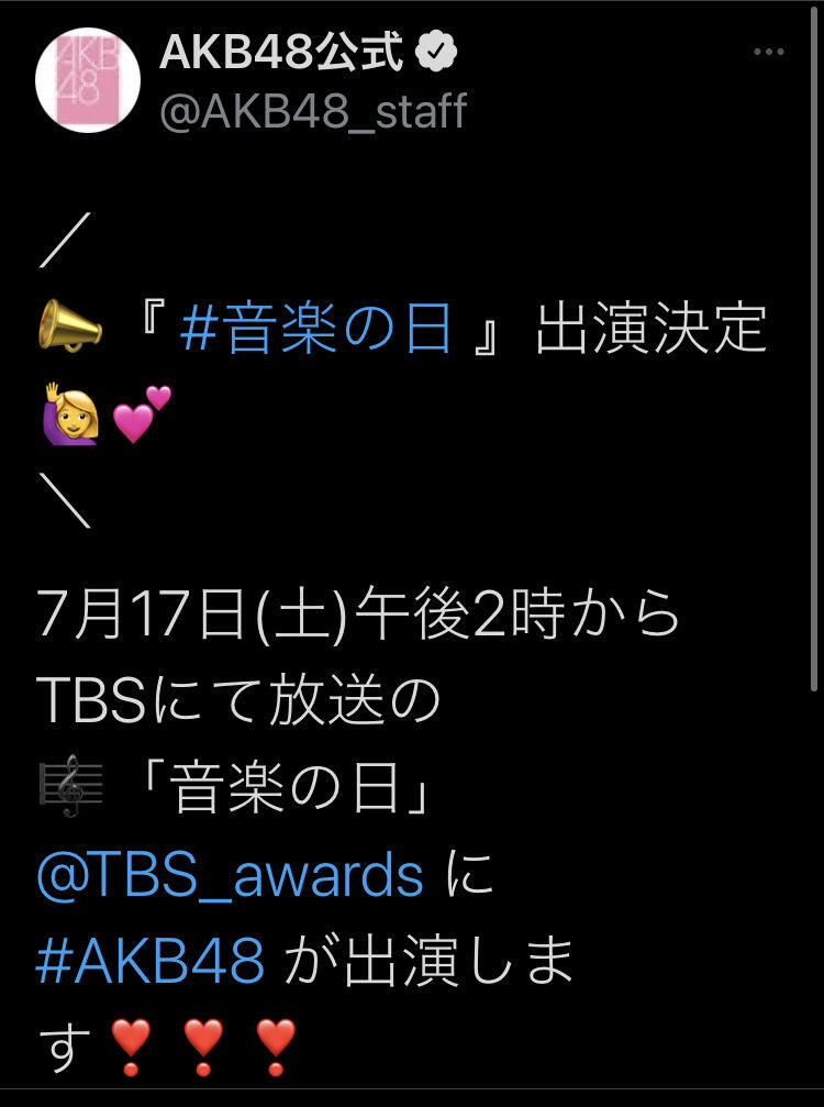 【朗報】AKB48、TBS音楽の日に出演決定!!! 投稿日 2021年7月6日 10:17:44 (AKB関連) Tweet スポンサードリンク 続きを読む Source: AKB48タイムズ(AKB48まとめ) スポンサードリンク 続きを読む>> 最新情報 【朗報】AKB48のマレーシアイベント、大盛況で無事に終了!!! 【画像】この子アイドルで通用しますか?【HKT487期研究生 江浦優香13才】 【朗報】外ドラマ出演のAKB48山﨑空ちゃんの演技が上手いと話題に【あなたの恋人、強奪します。/そらら】 【朗報】近々新曲のMV撮影が行われる模様!【AKB48】 【朗報】19期研究生全員当たり!!!【AKB48劇場公演デビュー】 【朗報】ベルク×ニップン「AKB48 17期生 もちっとおいしいコラボキャンペーン」がスタート!!! 【速報】最新の久保怜音さんがキタ━━━━(゚∀゚)━━━━!!【元AKB48さとぴー】 【速報】STU48森下舞羽が卒業発表!!【まいはっち】 【AKB48】村山彩希さん、ついにインスタの個人アカウントを作る!!【ゆいリーInstagramデビュー】 【AKB48】クアラルンプール2日目、髙橋彩音ちゃんにぶっかけられて喜ぶ現地民をご覧下さい【マレーシア】 【悲報】地下アイドル現場怖い😱 女優業って正直ファンとしては辛い事ばかりで全然嬉しくないよね?【AKB48/SKE48/NMB48/HKT48/NGT48/STU48】 【朗報】元AKB48チームTP・邱品涵さん、福岡ソフトバンクホークスのチアガールに転身し大成功!!! 【AKB48】卒業記念生写真を出せるメンバーの基準ってどうなってんの? 【朗報】元AKB48奥原妃奈子さん、渋谷の大型ビジョンに現れる!【元チーム8ひーな】 昨日は岡田パッパの誕生日です【元AKB48岡田奈々】 【悲報】アイドルさん、ビラ配り中にまたしても酷い目に遭ってしまう【カリギュラのぶちあげイエロー担当ゆめぴりか】 【朗報】NGT48奈良未遥、ファースト写真集「こんな風に見られているのか?」7月1日発売決定!!! 【KLP48】クアラルンプール2日目に起こりそうなこと【AKB48】 今度こそ正真正銘のずっきーの谷間キタあああああ?【AKB48山内瑞葵】 【衝撃】松井珠理奈がアイドル復帰!マレーシア初の48姉妹グループ・KLP48プレイングマネージャーに就任決定!正式発表【元SKE48】 【AKB48】オリジナルステッカー販売終了のお知らせ【ピンポン玉チャレンジ】 【朗報】元馬嘉伶の真楪伶が1st写真集を発売決定!!【元AKB48・元まちゃりん・奇跡と出会った瞬間】 初めてAKB48劇場に入る私にアドバイス下さい!! スクエニ『トワツガイ』が僅か1年でサービス終了!大西桃香、渡辺みり愛、長谷川玲奈が実写化したのに【舞台化・元AKB48/元乃木坂46/元NGT48】 【悲報】=LOVE大谷映美里、体調不良のため本日の「個別お話し会」を欠席・・・【指原莉乃プロデュースアイドル・イコラブ・イコールラブ】 「ゆいずき」のダブルセンターというAKB48最強のカード【小栗有以・山内瑞葵】 【朗報】AKB48橋本陽菜、マレーシア移籍は断ったけど、旅行気分の数日間なら喜ぶ!!【はるぴょん】 【AKB48】メンバーが公演後に受け取ったファンレターをうpしてるのだが、どう思う? 【AKB48】正鋳真優「いつかAKBにチーム制を復活させたい」【まさるさん】 【AKB48G】推しメンにガッカリした時はどうすればいいか【AKB48グループ】 今夜発表される AKB48の選抜メンバーを予想しよう(^∇^)【乃木坂に、越されました ~AKB48、色々あってテレ東からの大逆襲!~】